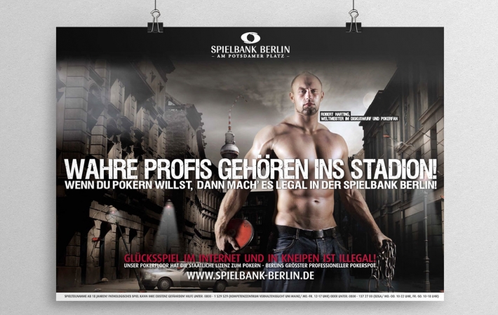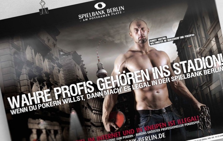 Für die Spielbank Berlin hat die PPAM Werbeagentur Berlin ein neues Leitmotiv für die aktuelle Werbekampagne entwickelt. Zentrales Element ist der Olympiasieger und Weltmeister im Dikuswerfen Robert Harting. Die Spielbank Berlin möchte mit dieser Kampagnen zu legalen Pokerspiel im Casino aufrufen und so den immer beliebter werdenden Pokersport noch mehr in den Fokus rücken. Dabei geht es der Spielbank Berlin allerdings nicht um den “erhobenen” Zeigefinger, sondern vielmehr um die vielfältigen Möglichkeiten und das besondere Ambiente, dass das Pokerspiel in einem echten Casino bietet.